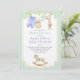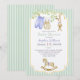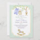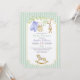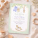 A baby shower invitation featuring an arrangement of cute baby clothes hanging to dry on a line, a cute stuffed bunny, an adorable rocking horse at the bottom of the card, and all of these items surrounded by delicate branches with light green leaves.