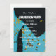 Invitation de la fête de graduation qui comporte une casquette noire de graduation et des confettis d'or contre un arrière - plan de couleur bleue turquoise, ainsi que la date de l'événement, le nom du groupe, l'année de la classe de graduation, le nom de l'école, l'heure, l'adresse et les coordonnées imprimées en lettres blanches. Personnalisez votre invitation en remplaçant info par la vôtre. Sélectionnez le style et la quantité de papier d'invitation.