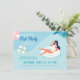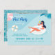 Ces simples invitations à la fête de la piscine de remise de diplômes sont sûrs de faire la fête d'été! Modèles de texte à l'avant et modèle photo à l'arrière. palmiers tropicaux en haut à droite, ballon de plage en haut à gauche, radeau de sauvetage et brune sur un tube intérieur flottant dans la piscine.