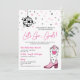Invitation à la soirée dansante sur le thème de la discothèque Cowgirl en rose, blanc et noir avec une boule disco entourée d'étoiles. Allons la fille en rose-chaud. Une mignonne cowgirl botte en rose avec les coeurs et les étoiles. Le dos est orné d'un motif de vache noir et blanc.