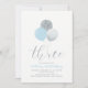 Célébrez une journée spéciale pour votre bien-aimé avec cette mignonne invitation de fête du 3e anniversaire! Ce design présente une typographie élégante "Trois" avec ballons et confettis dans un combo bleu clair, gris et argent. Correspond à votre invitation à vos décorations de fête d'anniversaire. Une invitation unique pour un 3ème anniversaire moderne pour un garçon.