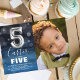 Invitation moderne à la fête du cinquième anniversaire pour votre petit bambin, conçu avec une photo du garçon/fille d'anniversaire, un arrière - plan bleu azur à l'ombre, des confettis transparents à bulles, et un grand ballon d'hélium numéro cinq en argent. Le nom de l'enfant est écrit en gros texte calligraphie blanc avec un simple modèle d'anniversaire en dessous qui est facile à customiser.