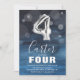 Invitation de quatrième anniversaire moderne pour votre petit bambin, conçu avec un arrière - plan bleu azur sombre, confetti de bulle transparente, et un grand ballon d'hélium numéro quatre argent. Le nom de l'enfant est écrit en gros texte calligraphie blanc avec un simple modèle d'anniversaire en dessous qui est facile à customiser.