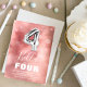 Invitation moderne à la fête du quatrième anniversaire pour votre petit, conçu avec un arrière - plan rose aquarelle à l'ombre, confetti de bulle transparente, et un grand ballon d'hélium numéro quatre en argent. Le nom de l'enfant est écrit en gros texte calligraphie blanc avec un simple modèle d'anniversaire gras en dessous qui est facile à customiser.