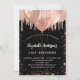 Un arrière - plan noir. Décoré avec de l'or rose, des gouttes, la peinture goutte à goutte et des ballons. Personnalisez et ajoutez un nom, 21 ans et les détails de la fête. Le nom est écrit avec un script de style manuscrit