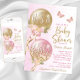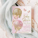Invitation baby shower rose et or avec de jolis ballons roses et or avec fleurs, papillons et arcs sur un arrière - plan rose et blanc. Cette invitation mignonne baby shower rose et or est facilement customisée avec vos détails de l'événement.