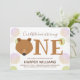 Notre petit ours est en train de lancer une première invitation d'anniversaire de naissance. Cette invitation est brune, blanche, rose et verte avec le mot "One" en grandes lettres avec une illustration du visage d'ours comme première lettre du mot et ballons rose et vert. Customisez simplement cette invitation, ajoutez-la à votre panier, et joyeux anniversaire à votre merveilleux bébé! Bear Balloons Baby First Birthday Invitation Jours fériés Conception | ©Melissa Patton - Artiste/Illustrateur