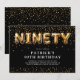 Invitation moderne pour les 90 ans avec un fond noir élégant, une dispersion de confettis dorés, des ballons en hélium dorés qui épellent "quatre-vingt-dix", et un modèle de texte de fête élégant facile à personnaliser.