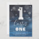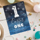 Invitation moderne de fête de premier anniversaire conçu avec un arrière - plan bleu eau sombre, confetti de bulle transparente, et un grand ballon d'hélium numéro un en argent. Le nom de l'enfant est écrit en gros texte calligraphie blanc avec un simple modèle d'anniversaire en dessous qui est facile à customiser.