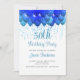 Ballons bleu néon et turquoise et confetti 50ème anniversaire invitation, 50 avec finesse. Les tons bleus sur le blanc. Personnalisez-vous pour votre fête.