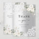 Un carte de remerciements de baptême moderne et élégant, neutre pour les hommes et les femmes. Un arrière - plan faux argenté. Décoré de roses blanches, fleurs florales, dentelle et une petite croix. Retour : Modèle pour une note de remerciement et nom.