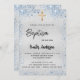 Un baptême moderne et élégant, célébrant un bébé garçon. Arrière - plan à l'aspect argent faux décoré de faux parties scintillant bleus brillants et d'une croix dorée. Personnalisez et ajoutez un nom et des détails du parti. Lettres de couleur noire.