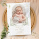 Un élégant baptême ou une invitation à la personnalisation avec une photo spéciale et des détails en lettrage doré chic sur ce design moderne avec une élégante arche dorée et une aquarelle feuillage verdoyante. Conçu par Thisisnotme©