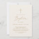 Cette délicate invitation à la crème de calligraphie or croix baptême est parfaite pour un baptême de bébé moderne. Le design minimaliste romantique présente une belle et élégante typographie de champagne jaune doré sur un arrière - plan de crème d'ivoire au look épuré et sobre.