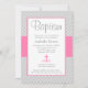 Une invitation rose et grise élégante de baptême ou de baptême. En comportant un chevron gris et blanc modelez et dentelez la croix. À la mode et moderne -- personnalisez facilement pour votre événement !