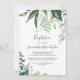 Cette invitation au baptême de verdure estivale est parfaite pour un élégant baptême de bébé du milieu de l'été. Le design botanique présente un agencement luxuriant d'eucalyptus couleur aquarelle peint, de verdure et de feuilles verts.