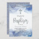 L'invitation moderne au baptême de garçon en argent et bleu présente une croix d'argent, un scénario de typographie "Baptême" et un cadre de parties scintillant faux. Personnalisez avec un nom et des détails.