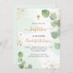 Un arrière - plan blanc et vert clair décoré de verdure d'eucalyptus et de poussière de parties scintillant en faux or. Personnalisez et le nom des enfants et les détails de la cérémonie. Lettres noires et dorées. Non sexiste.