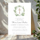 Une invitation au baptême moderne personnalisable avec un délicat lis de la vallée design floral entourant une croix dorée ornée, sur un arrière - plan propre avec lettrage élégant.