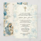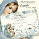 Avec une belle invitation Baptismal Christening conçue sur mesure avec une bordure florale bleu azur, la Bienheureuse Vierge Marie tenant Jésus et un verset d'écriture sur le devant. Tout le texte et les polices peuvent être modifiés.