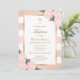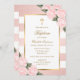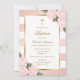 Elégante invitation au baptême floral rose vif avec une croix d'or et un cadre orné de roses blush et souffle de bébé.