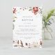 Cette simple invitation au baptême floral est parfaite pour un baptême de bébé rustique. Le design boho fantaisiste est composé de fleurs rustiques roses rousses, bordeaux et marsala aux tonalités sobres et romantiques.