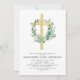 Floral Sage Green Girl's Eucalyptus and Gold Wooden Cross and Wreath Botanical Greenery Watercolor Christian Religious Baptism Invitations.