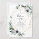 Vert eucalyptus tendance et fleurs pavot dans les tons pastel baptisme invitation avec cadre géométrique or et élégante typographie manuscrite.