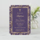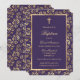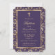 Élégantes invitations au baptême à la floraison violette et or avec une croix d'or à l'intérieur d'un cadre fleuri.