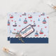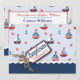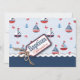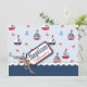 Carte d'invitation au baptême sur le thème nautique avec voiliers, crabes et ancres avec un arc et une étiquette en forme de fil 3D.