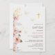 Papillon rose chic floral Christening Baptême Invitation Baptême doux ou invitation à baptiser avec une croix d'or, rose, or et gris chic arrangement floral et papillons sur un arrière - plan blanc off.