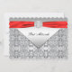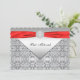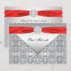 Élégant nœud en ruban de satin rouge diamanté avec un motif en dentelle de diamant argenté sur une invitation de Bat Mitzvah.