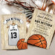 invitations décontractées à la fête de mitzvah avec un arrière - plan de terrain de basket, un maillot blanc avec votre nom d'enfant, numéro et la star de david. Au verso se trouve le bar mitzvah détails de célébration avec un basket-ball au fond.