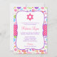 Une invitation Bat mitzvah amusante à thème bonbons. Design dispose d'un motif de bonbons en violet, rose, vert, bleu et orange. Graphiques par www.jwillustrations.com