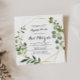 Cette invitation de bat mitzvah de calligraphie tropicale d'or géométrique est parfaite pour un bat mitzvah simple. Le design présente de beaux feuilles verts peints à la main, ornant un cadre géométrique doré.