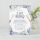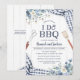 Invités Invitations à un thème bleu I Do BBQ couples douche ou dîner de répétition décontracté pour célébrer le couple heureux! Cette invitation présente des flancs d'aquarelle bleu poussiéreux avec des accents de en vichy marine contre un panneau de grange blanc.