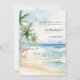 An elegant wedding invitation for a beach wedding, destination wedding. A watercolored sandy beach, ocean waves and palm trees as background.