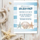 Nautique Invitation de fête de vacances avec des coquillages de plage peints à la main, aquarelle avec coup de pinceau, rayures bleu et blanc rustique. Les détails de la fête sont en lettres bleu marine et peuvent être facilement personnalisés. Le côté inverse est un bleu marine classique.