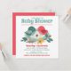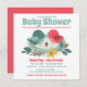 Une mignonne invitation Baby shower conçue avec une famille d'oiseaux sucrés colorés dans les tons rouge et vert sur un arrière - plan blanc. l'inverse est un rouge vif assorti. Pour personnaliser, il vous suffit de remplacer l'exemple de texte en utilisant notre modèle simple pour compléter tous vos détails.
