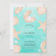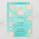Notre petite perle est en route ! Annoncez votre prochain baby shower avec des invitations peintes à la main, avec une jolie illustration de coquillages, d'huîtres, d'étoiles de mer en parties scintillant beige et faux or avec une perle irisée et des bulles d'eau sur bleu aquarelle dégradé océan arrière - plan. Le script de brosse moderne ajoute une touche d'élégance à ces invitations uniques qui sont parfaites pour toute célébration été et plage-océan.