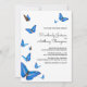 Une faire-part de mariage subtile mais belle, avec une collection de papillons bleus flottants sur un arrière - plan blanc classique et un élégant modèle de mariage facile à customiser.