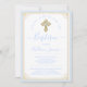 Elégante invitation baptême bleu bébé et or avec belle croix d'or sur un point bleu bébé et arrière - plan frontière or. Cette invitation au baptême garçon est facilement customisée pour votre événement en ajoutant vos détails. Vous pouvez retirer la perle bleue de la croix si vous le préférez.