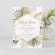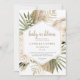 Un joli boho style terrien cadre or neutre invitation baby shower d'aquarelle florale, avec des fleurs crémeuses de perles dans les couleurs crémeuses avec des touches de vert, et palmetto séché feuilles et eucalyptus. Un joli mélange de script et de couleur serif dans les tons pastel tan et gris. Le dos de l'invitation a un effet lin dans un brun. Style rustique terreux. Parfait pour le printemps et l'été, le désert ou l'ambiance tropicale.