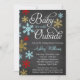 Adorable invitation à la douche bébé à thème hivernal. Doté d'une police de script avec l'expression "Baby It's Cold Outside", avec des flocons de neige bleus, rouges et dorés sur un motif arrière - plan de tableau de bord. Moderne et mignon pour un baby shower garçon.