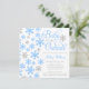 Une adorable invitation au baby shower sur le thème de l'hiver. Doté d'une police de caractères avec la phrase "Baby It's Cold Outside", avec des flocons de neige bleus et gris. Moderne et mignon pour un baby shower garçon.