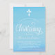 Invitation Élégante Et Moderne. Ce design présente le Arrière - plan d'aquarelle bleu, croix et "baptême" en écriture moderne. Pour modifier ce modèle, cliquez sur customiser plus loin.