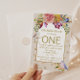 Cette invitation va certainement devenir un souvenir ! Conçu avec un motif floral aquarelle sur le dessus, accentué par des lampes à cordes et des oiseaux bébés. L'arrière - plan est moucheté d'abeilles à bosses d'or. Ces cartes vous impressionneront certainement. Célébrez son premier anniversaire avec style !