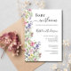 Une belle aquarelle design fleur sauvage avec des fleurs sauvages rose violet et jaune avec une invitation baby shower libellule. Parfait pour le baby shower de vos petites filles.