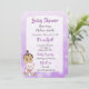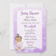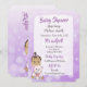 Bébé fille hispanique ou afro-américaine avec un ours en peluche Invitations pour une baby shower avec un fond violet.