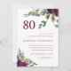 Belle et chic aquarelle botanique fleurie et verdoyante invitation à la fête de quatre-vingts ans, présente un joli dossier rose pastel avec des fleurs et verdure bordeaux violet, et un front blanc avec élégante 80 typographie et fleurs avec feuillage.